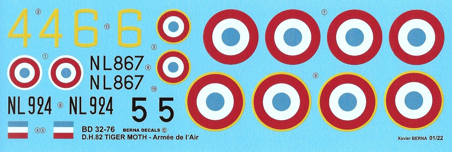 Berna Decals - 1/32 French De Havilland D.H.82 Tiger Moth: Ec 2/595 Tong (Indochina) 1941, NL867 Meknes (Morocco) 1946 & NL924 Cognac (France) 1946