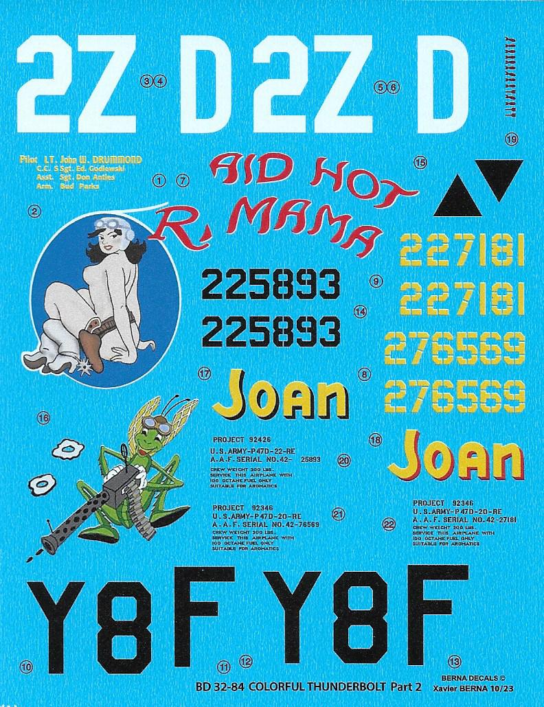 Berna Decals - 1/32 Republic P-47D Colourful Thunderbolts Part 2: P-47D-20-RE 'Raid hot Mama' s/n 42-27181 or 42-76569 510th Fs / 405th Fg England 05/1944, P-47D-22-RE 'Joan' s/n 42-25893 507th Fs / 404th Fg Winkton 06/1944