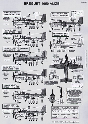 Berna Decals - 1/48 Breguet 1050 Alize (7) Flottilie 4F/No 17 1982; Flot 6F/No 50 1985; Flot 6F/No 312 1997; Flot 9F No 65; Escadrille 3S/No 8 1975; Escadrille 10S/No 52 1986; Escadrille 59S/No 52 1973