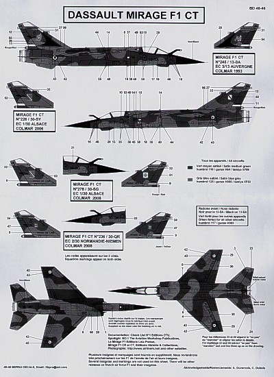 Berna Decals - 1/48 Dassault Mirage F.1CT (4) No 245/13-SA Ec 3/13 Auvergne 1993; No 226/30-SY EC1/30 Alsace 2006; No 278/30-SG EC1/30 Alsace 2008; No 236/30-QR EC2/30 Normandie-Niemen 2008. Data etc. for one aircraft.