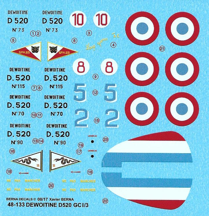 Berna Decals - 1/48 Dewoitine D 520 GC I/3: S/Lt Hubert de Salaberry n 115 code 8 - 05/1940, S/Lt Michel madon n 90 code 2 - 06/1940, S/Lt Georges Blanck n 70 code 5 - 05/1940, Adj AndrÈ Carrier n 73 code 10 - 05/1940.