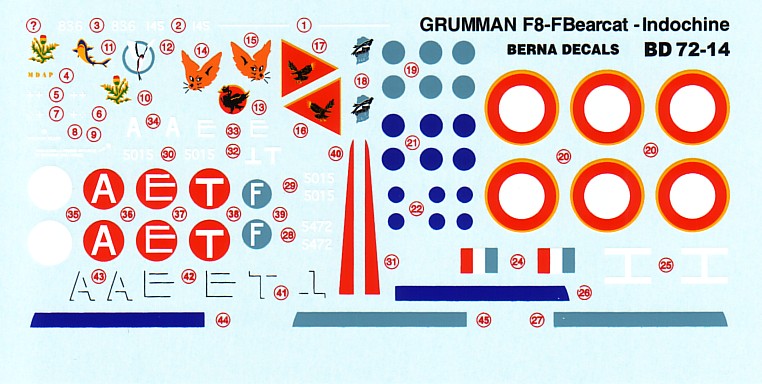 Berna Decals - 1/72 French Grumman Bearcat over Indochina : E and T of Gc I/9 'Limousin' Cat-Bi 1951-52, F of Gc II/8 'Languedoc' Cat-Bi 1952-53, A of Gc I/21 'Artois' Bach-Ma ' 1953, H of Erom 80 Bach-Ma ' 1954