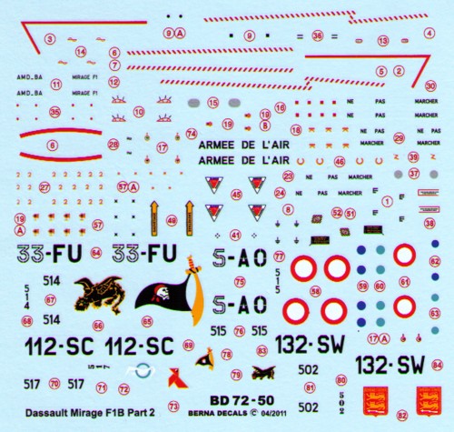 Berna Decals - 1/72 Dassault_Mirage F.1B 4 No 517/112-SC 2/33 Savone Reims 2010, No 502/132-SW 2/30 Normandie-Niemen Colmar 2009,No 514/33-FU Ec 3/33 Lorraine Reims, No 515/5-AO EC3/5 Comtat-Venaissin Orange 1986,