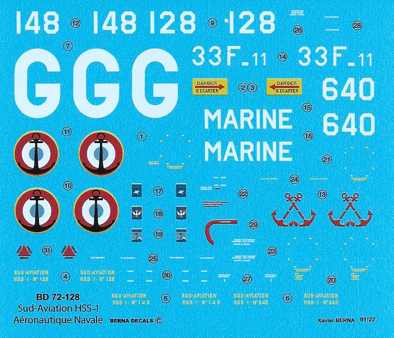 Berna Decals - 1/72 Sud-Aviation HSS-1 (Sikorsky H-34) : 33F-11 (flotille 33F) Algeria 1959, 640 (escadrille 20S) Saint-Rapha«l 1970, 128 (flotille 31F) Saint-Mandrier 1972, 148 (flotille 33F) Saint-Mandrier 1976.