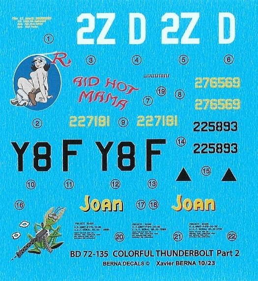 Berna Decals - 1/72 Republic P-47D Colourful Thunderbolts Part 2: P-47D-20-RE 'Raid hot Mama' s/n 42-27181 or 42-76569 510th Fs / 405th Fg England 05/1944, P-47D-22-RE 'Joan' s/n 42-25893 507th Fs / 404th Fg Winkton 06/1944.