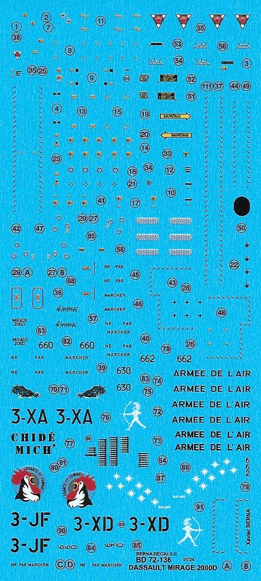 Berna Decals - 1/72 Dassault-Mirage 2000D based at Nancy-Ochey: 662 coded 3-XA Ec 1/3 'Navarre' 2021, 630 coded 3-XD Etd 2/7 'Argonne' 2016, 660 coded 3-JF Etd 4/3 'Argonne' 2018 + Stencils 3 schemes