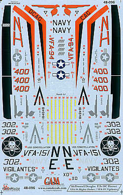 Cam Decals - 1/48 McDonnell-Douglas F/A-18C Hornet (2) 164048 NH/400 VFA-94 Mighty Shrikes Uss Carl Vinson 2001 Op Enduring Freedom, 164897 NE/302 VFA-151 Vigilantes Uss Constellation 1995