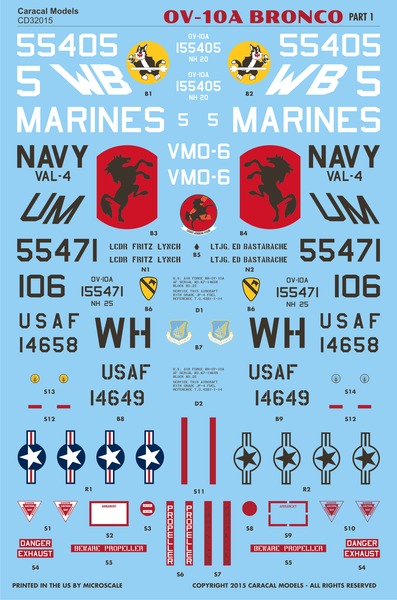 Caracal Models - 1/32 North-American/Rockwell OV-10A Bronco. Specially designed for counter-insurgency (COIN) operations from the outset, the versatile OV-10 Bronco served the US military with distinction from the Vietna m War to the first Gulf War, and many examples are still serving around the world. Our first 1/32 scale decal sheet for the OV-10A provides a wide variety of marking options for this important combat aircraft. The options on this decal sheet are: OV-10A Bronco 67-14658, 19th TASS, USAF (Vietnam) OV-10A Bronco 67-14649, 22nd TASS, Wheeler AFB, USAF OV-10A Bronco BuNo. 155405, VMO-6, US Marine Corps OV-10A Bronco BuNo. 155471, VAL-4 "Black Ponies", US Navy (Vietnam) [OV-10A/C]