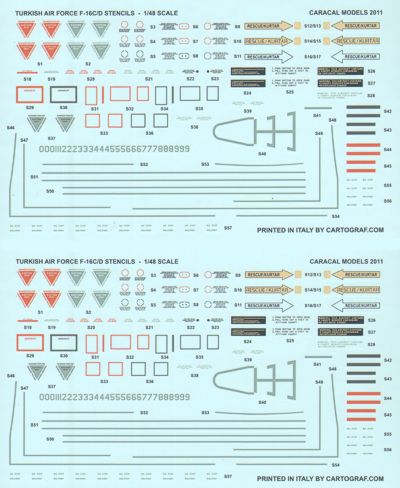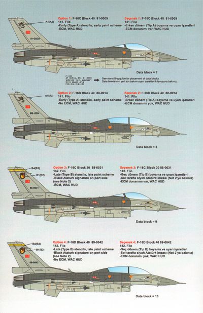 Caracal Models - 1/48 Lockheed-Martin F-16C/F-16D Turkish Air Force Part 1. Full markings, numbers, national insignia, squadron badges etc to build any aircraft from 141 Filo, 142 Filo, 143 Filo, 151 Filo, 152 Filo, 161 Filo and 161 Filo. 22 very colorful options.
