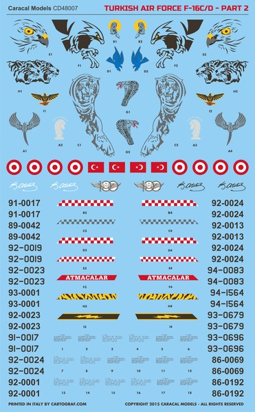 Caracal Models - 1/48 Turkish Air Force F-16C/D Part 2: this Turkish F-16 sheet provides 18 more markings options for squadrons not covered in Part 1. The Turkish Air Force has been an F-16C/D operator since 1987, and flies one of the largest F-16 fleets in the world after the US. This decal sheet is the second instalment of a series of two sheets which will allow you to build single or twin-seater F-16s from every Turkish F-16 unit since mid 1990s, when colorful squadron insignia started appearing on these aircraft. This decal sheet is based on extensive research and we are confident that these are the most comprehensive and accurate Turkish Air Force F-16C/D decals ever designed. A set of stencils/maintenance markings are included. Part 2 of our Turkish F-16C/D series covers squadrons based in Balikesir and Diyarbakir air bases, as well as updated tail art for 143. Filo. The aircraft featured on this sheet are: F-16C Block 40 91-0017, 132.Filo F-16C Block 40 92-0019, 181.Filo F-16C Block 40 93-0001, 181.Filo F-16C Block 40 91-0017, 182.Filo F-16C Block 40 92-0001, 182.Filo F-16C Block 40 92-0013, 182.Filo F-16C Block 50 94-0083, 191.Filo F-16C Block 50 93-0679, 192.Filo F-16C Block 30 86-0069, 143.Filo F-16D Block 40 89-0042, 132.Filo F-16D Block 40 92-0023, 181.Filo F-16D Block 40 92-0023, 181.Filo F-16D Block 40 92-0024, 182.Filo (1998) F-16D Block 40 92-0024, 182.Filo (2008) F-16D Block 40 92-0024, 182.Filo (2011) F-16D Block 50 94-1564, 191.Filo F-16D Block 50 93-0696, 192.Filo F-16D Block 30 86-0192, 143.Filo