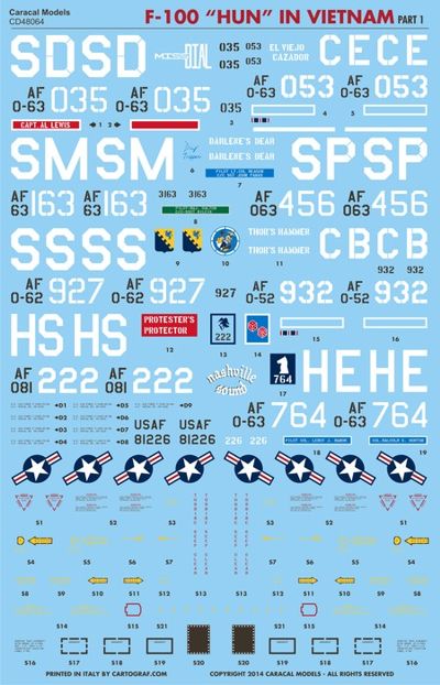 Caracal Models - 1/48 North-American F-100D Super Sabre Hun in Vietnam Part 1: The first installment of a two-sheet series chronicling the service of F-100 in Vietnam, this sheet features nine camouflaged Huns from different units. Many of these interesting options have not been done in decal form before. The sheet includes enough stencilling and national insignia to build any two of the aircraft featured on the sheet.