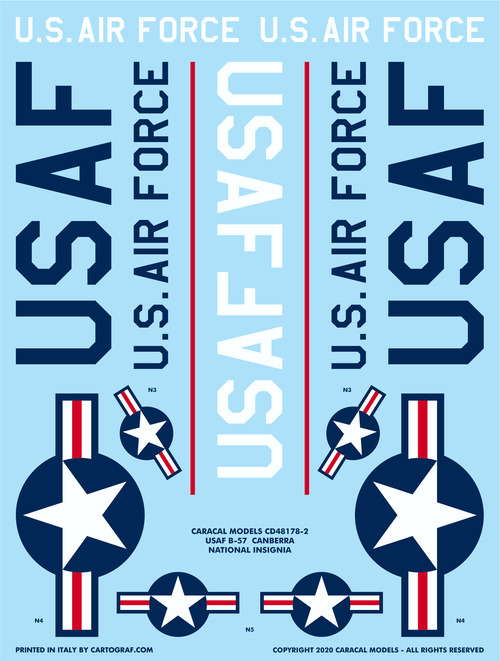 The B-57, the American-built version of the highly successful Canberra, has the distinction of being the first jet-powered bomber to drop munitions in anger. In addition to performing successfully as a bomber in Vietnam, the versatile Canberra was adapted for many different roles in the USAF. This 1/48 scale decal sheet for the B-57 provides post-Vietnam War period markings for aircraft in different roles.