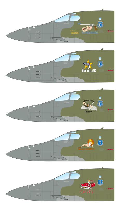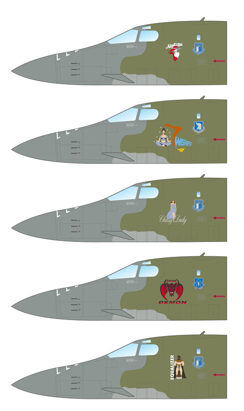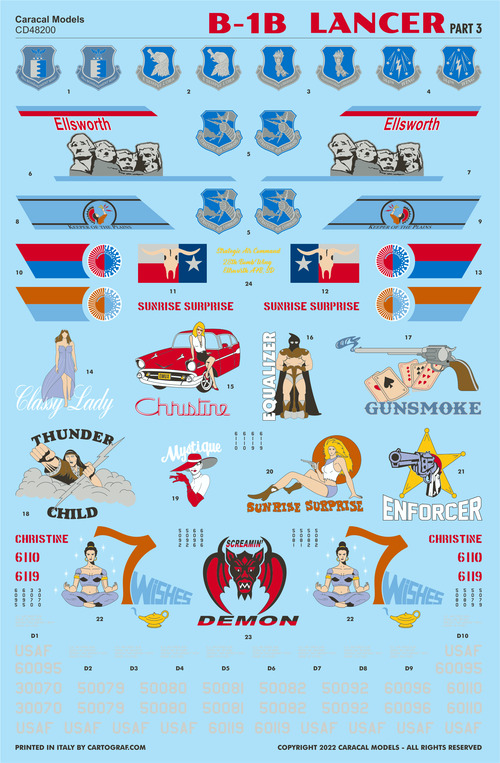 Caracal Models - 1/48 Rockwell B-1B Lancer Part 3 Multiple marking options for camouflaged USAF B-1B Lancers from the 1980s early 1990s. Our third 1/48 scale set for the B-1B Lancer features markings for aircraft from the early Strategic Air Command years of the B-1B operations. We provide options for ten camouflaged Lancers, each with unique and colorful nose art. The aircraft featured on this sheet are: