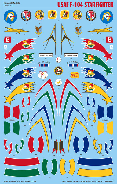 This comprehensive decal set features fifteen (15) marking options for Cold War era USAF Starfighters, both from active duty units and the three Guard units selected to fly the type. The set includes a very comprehensive, carefully designed stencilling sheet with the attention to detail you expect from Caracal.