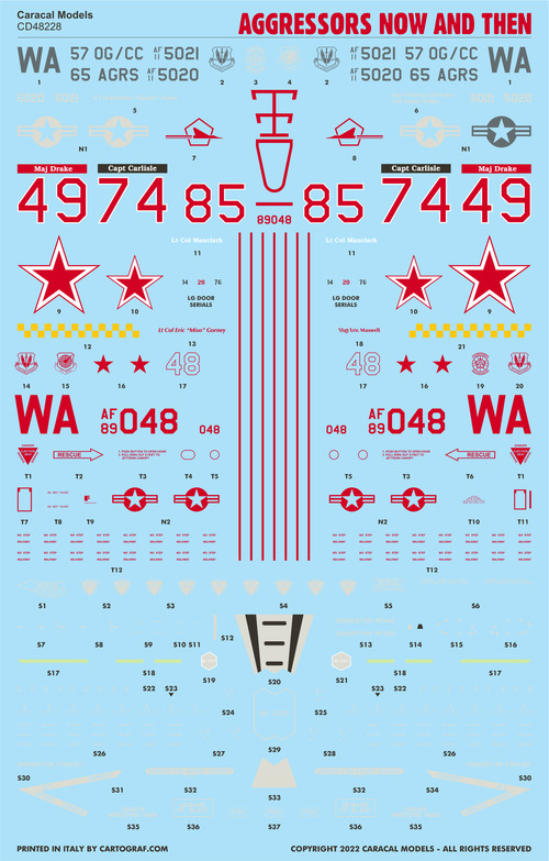 This multi-subject sheet features markings for five different types of aircraft flown in aggressor roles by USAF. Starting with the most modern USAF jet to fly in this role (F-35A), we provide markings for the striking 'Wraith' F-16C in an overall black scheme, and three Soviet jets that were operated by the top-secret 'Constant Peg' program.