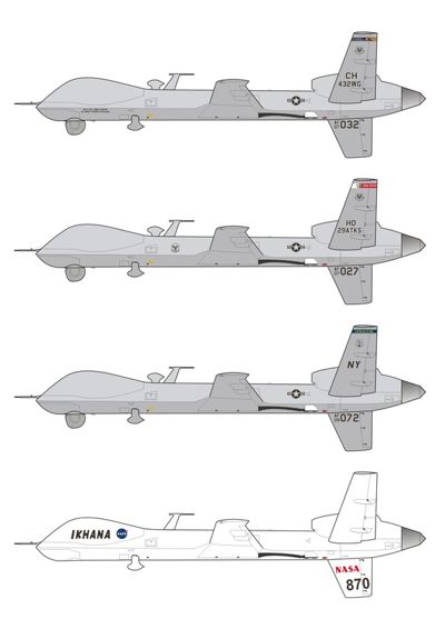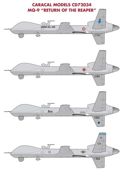 Caracal Models - 1/72 MQ-9 "Return of the Reaper" Eight marking options for the MQ-9 Reaper unmanned aerial vehicle, including Royal Air Force, French and Italian Air Force aircraft in addition to four USAF Reapers.