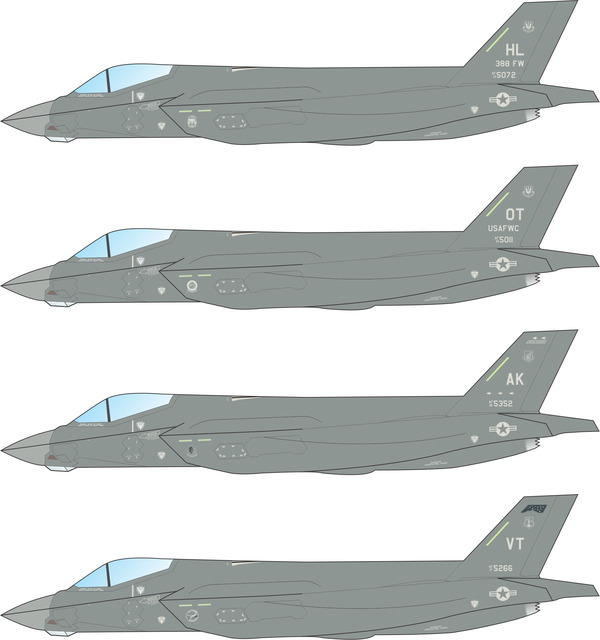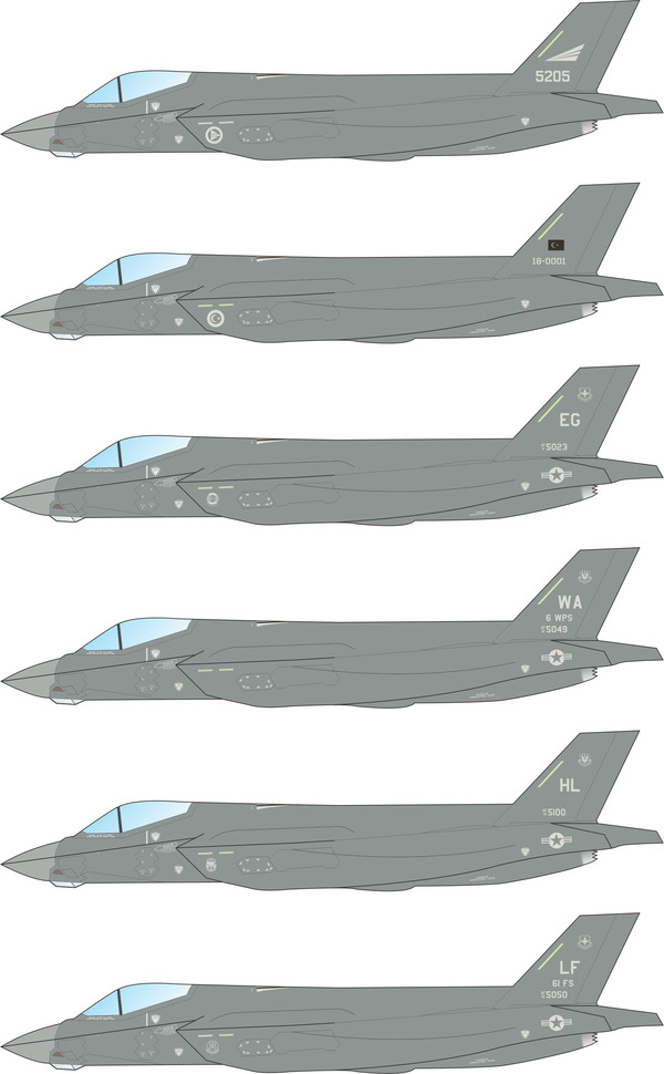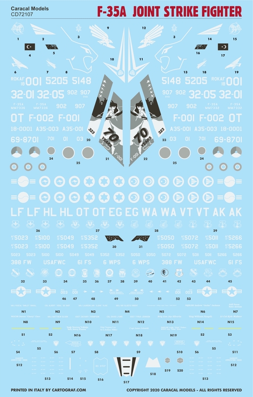 This 1/72 scale sheet for the F-35A features markings for most USAF and foreign current operators of the F-35A as of early 2020.