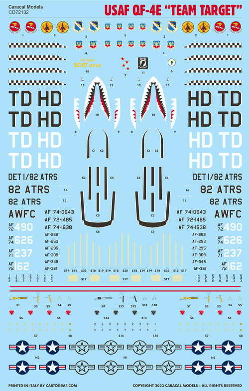 Caracal Models - 1/72 McDonnell QF-4E 'Team Target' The last Phantoms in USAF service were the QF-4E full-scale aerial targets, which were converted from the USAF Phantom inventory for optionally unmanned flight. This comprehensive 1/72 scale decal sheet provides markings for seven different QF-4E full-scale aerial targets of the 82nd Aerial Targets Squadron at Tyndall AFB. Many of these QF-4Es wear an attractive glossy finish that was seen on the aircraft of the unit just prior to the retirement of the type.