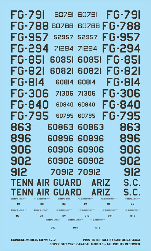 This comprehensive decal set features fifteen (15) marking options for Cold War era USAF Starfighters, both from active duty units and the three Guard units selected to fly the type. The set includes a very comprehensive set of stencilling with the attention to detail you expect from Caracal.