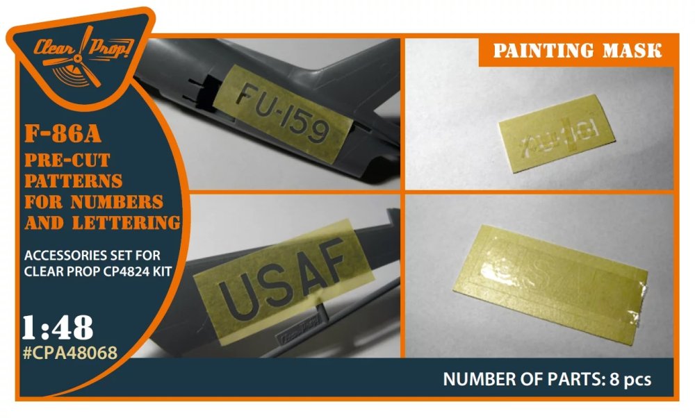 Clear Prop - 1/48 North-American F-86A Sabre pre-cut patterns for numbers and lettering painting mask USAF and code letters on 'yellow kabuki paper' for CP4824 kit (for Clear Prop)
