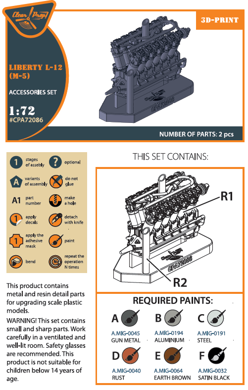 Clear Prop - 1/72 Liberty L-12 engine set 3D print (for Clear Prop kits) Airco DH.4 (American built), Airco DH.9A, Airco DH.10, Breguet 14 B2L, Caproni Ca.60, Curtis H-16, Curtiss H.S., Curtis N.C., Curtis Carrier Pigeon, Douglas C-1, Douglas DT, Douglas O-2, Felixstowe F5L, Fokker T.II, Handley Page H.P.20, Witteman-Lewis XNBL, Fokker C.IV