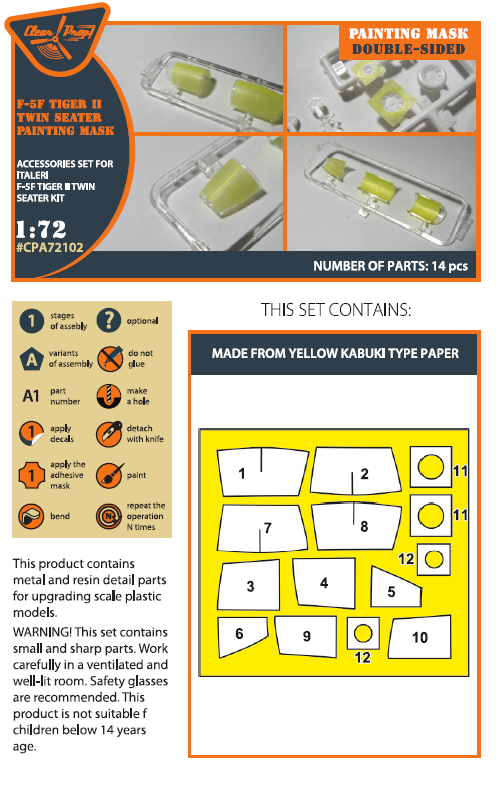 Clear Prop - 1/72 Northrop F-5F Tiger II canopy frame painting mask in and outside on 'yellow kabuki paper' for Italeri kits