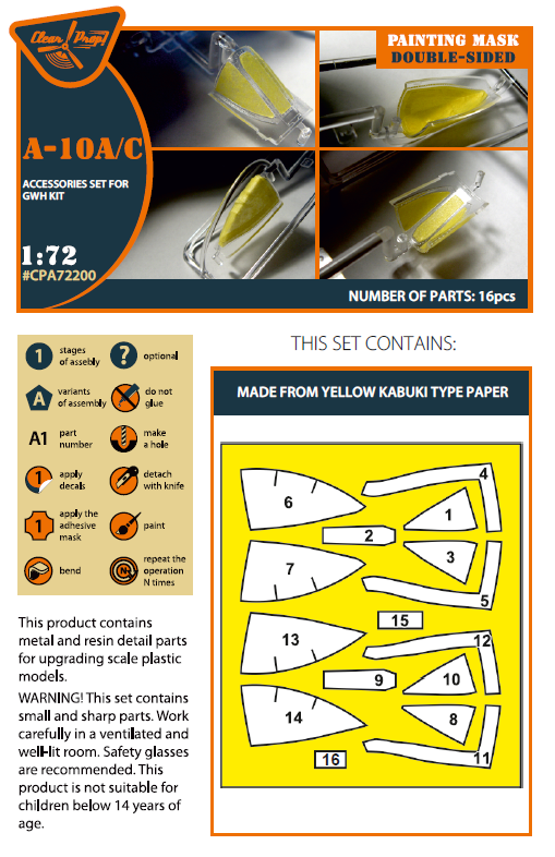 Clear Prop - 1/72 Fairchild A-10A/A-10C double-sided painting mask on 'yellow kabuki paper' for Great Wall Hobby