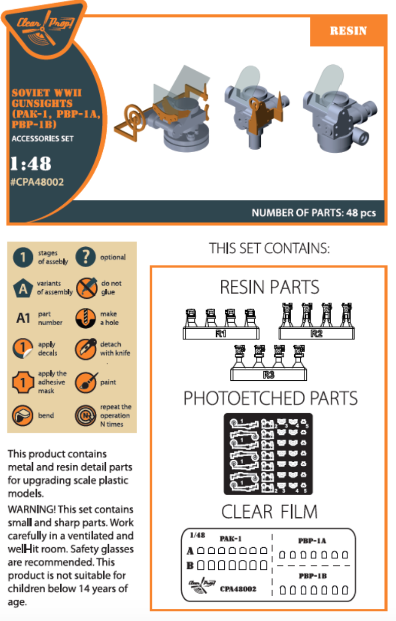 Clear Prop - 1/48 Soviet WWII gun sights (PAK-1, PBP-1A, PBP-1B) as used on Lavochkin La-5, La-7, LaGG-1, LaGG-3, Polikarpov I-153, I-16, I-180, I- 185, Mikoyan MiG-1, MiG-3, I-210, Yak-1, Yak-3, Yak-7, Yak-9, Petlyakov Pe-2, Pe-3, Tupolev Tu-2, Ilyushin Il-2, Il-10, KOR-2, I-207, I-28