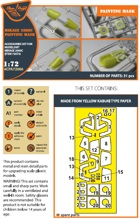Clear Prop - 1/72 Dassault Mirage 2000C painting mask on yellow kabuki paper (for Modelsvit kits)