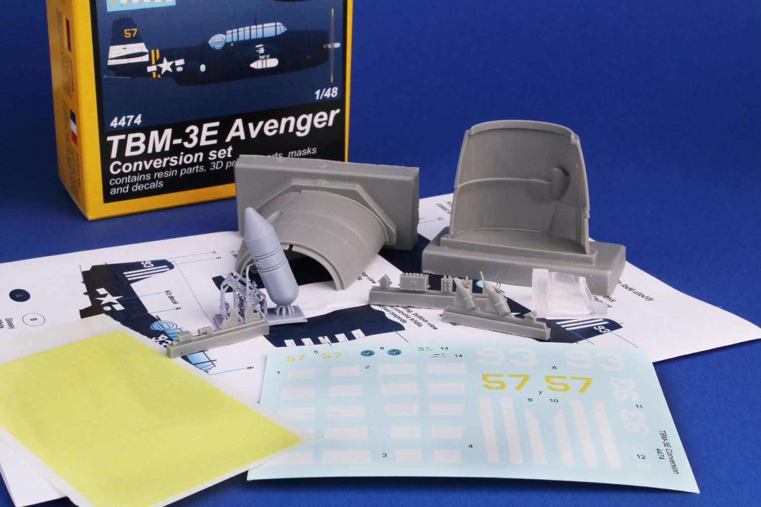 CMK - Grumman TBM-3E Avenger Conversion Set 1/48 / for Accurate/Academy kits The TBM-3E was a lightweight version of the Avenger which begun to come off production lines in 1944. The weight reduction brought better performance and the installation of the APS-4 underwing radar equipment enabled the Avenger for night missions. Our conversion set reflects both the outside and inside changes of the version-a new forward fuselage section, belly gunner station blank off parts, arrestor hook, radar and its rack for the starboard wing and the necessary interior equipment associated with the radar operation. The new parts are resin cast and some also 3D printed. This set is designed for Accurate Miniatures Avenger kits and all its reboxings by Italeri and Academy. THe decal sheet brings markings for two US Navy airframes operated in the Pto in WW2.