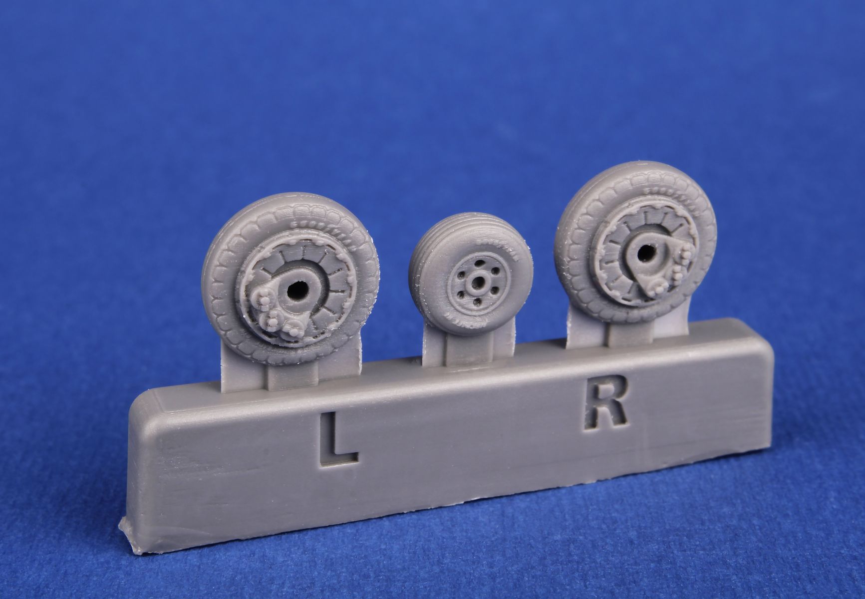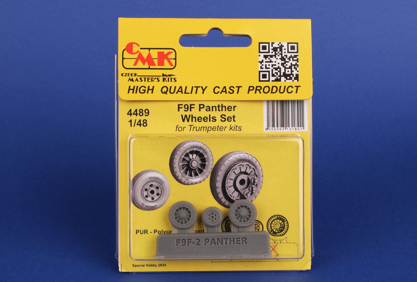 CMK - Grumman F9F Panther Wheels Set 1/48 / for Trumpeter kits New undercarriage wheels with excellent levels of detail for the 1/48 F6F-3/6 Cougar kit. The original kit items have some serious flaws. Our new wheels have the correct brake detail as well as nicely weighted tyres.