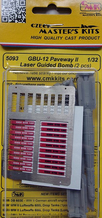 CMK - 1/32 GBU-12 Paveway II Laser Guided Bomb (2 pcs). Set contains 2 highly detailed aerial 500 Lb/ 227 Kg laser guided bombs. The bombs are cast in one piece including the fins with only separate guidance head. The set contains decal sheet with stencils and 20 color photo-etched Remove Before Flight tags. These bombs are in use by USAF, USMC and US Navy, most European air forces, including Czech Air Force and USA, EU / Modern