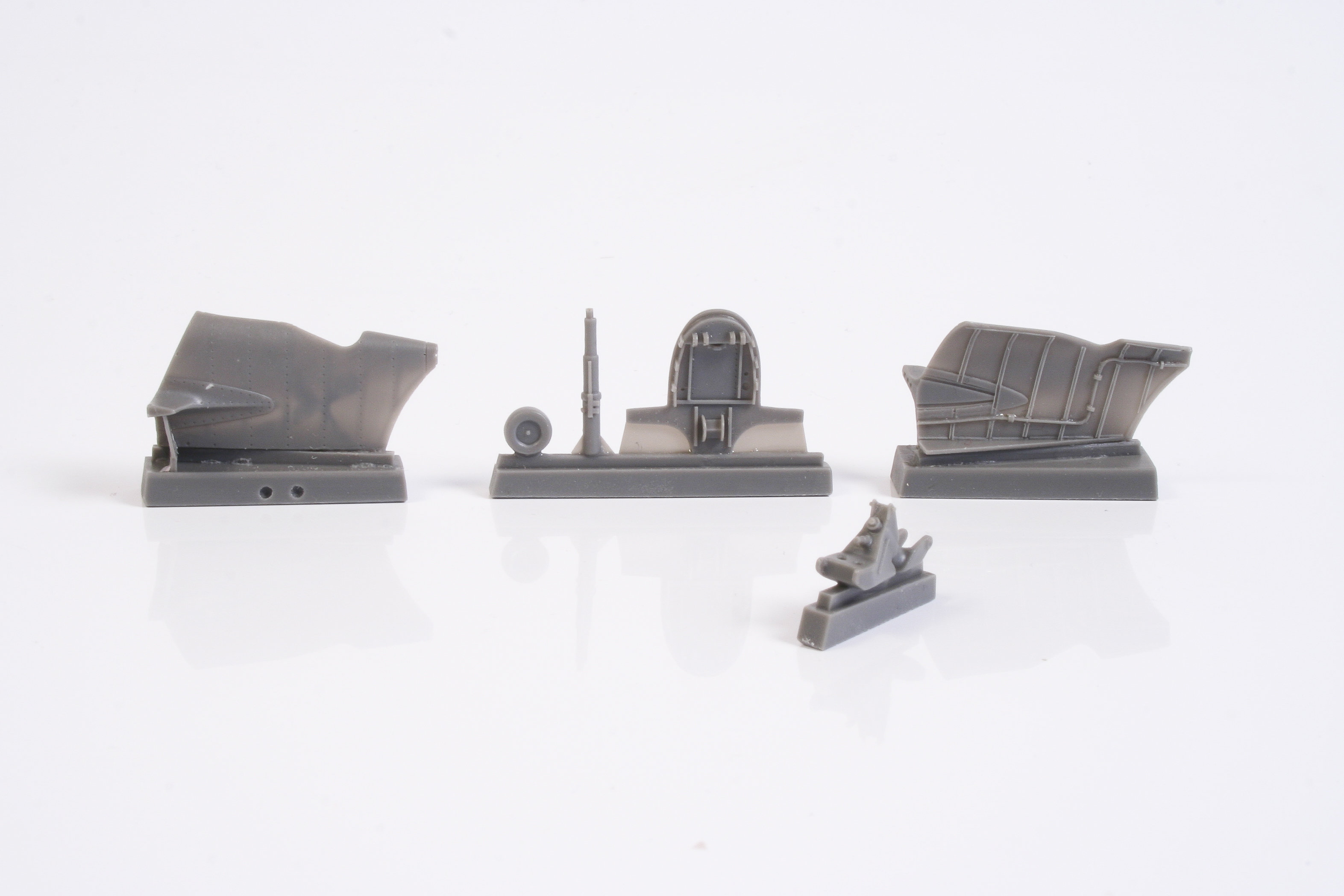 The set contains components enabling the modeller to remove the fairings above the tailwheel (fuselage bulkhead, new tailwheel, tailwheel strut, tail cone fairing panels) and show the tailwheel area including the fuselage bulkhead.
