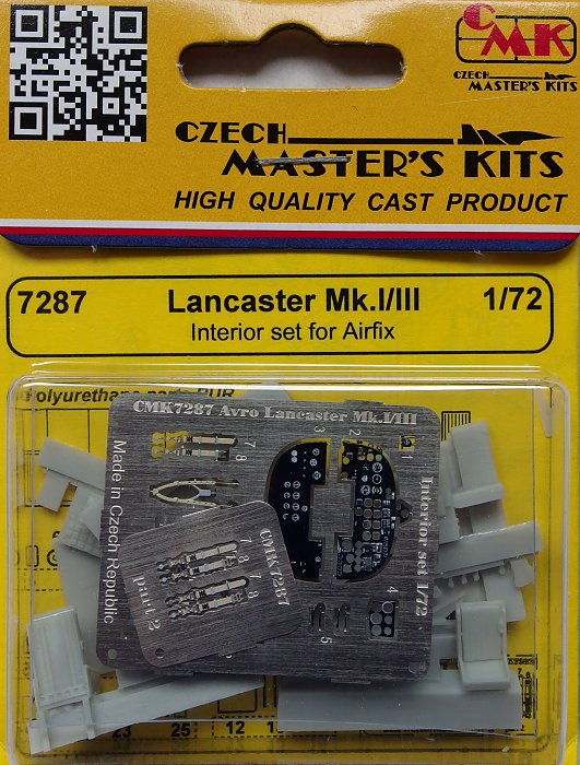 CMK - 1/72 Avro Lancaster Mk.I/III Interior set (for Airfix kits) Detailed set with new cockpit floor, seats, radio set, rudder pedal assembly, control column, instrument panel and other parts. Avro Lancaster was wide-spread four-engine WW2 Raf bomber. The set contains colour photo etches.
