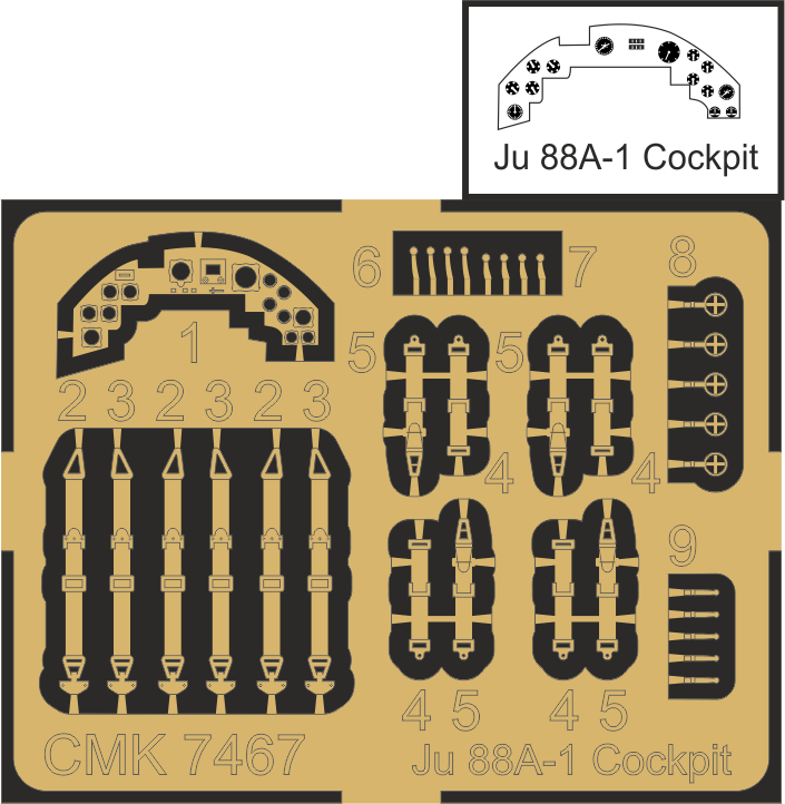 CMK - 1/72 Junkers Ju-88A-1 Cockpit. Detail cockpit set designed for the early Ju 88A-1 version of this famous German bomber plane. The set contains new cockpit floors, seats, sidewalls and armament. Resin parts are accompanied by a fret of etches (for Revell kits)