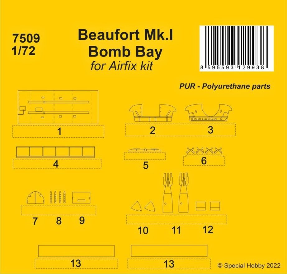 CMK - 1/72 Bristol Beaufort Mk.I Bomb Bay (for Airfix kits) Detail-oozing bomb bay for the Airfix Beaufort kit. The original styrene item contains just a torpedo, while new offering also brings the respective racks and bombs, as the Beaufort aircraft were often used in the bombing role, too.