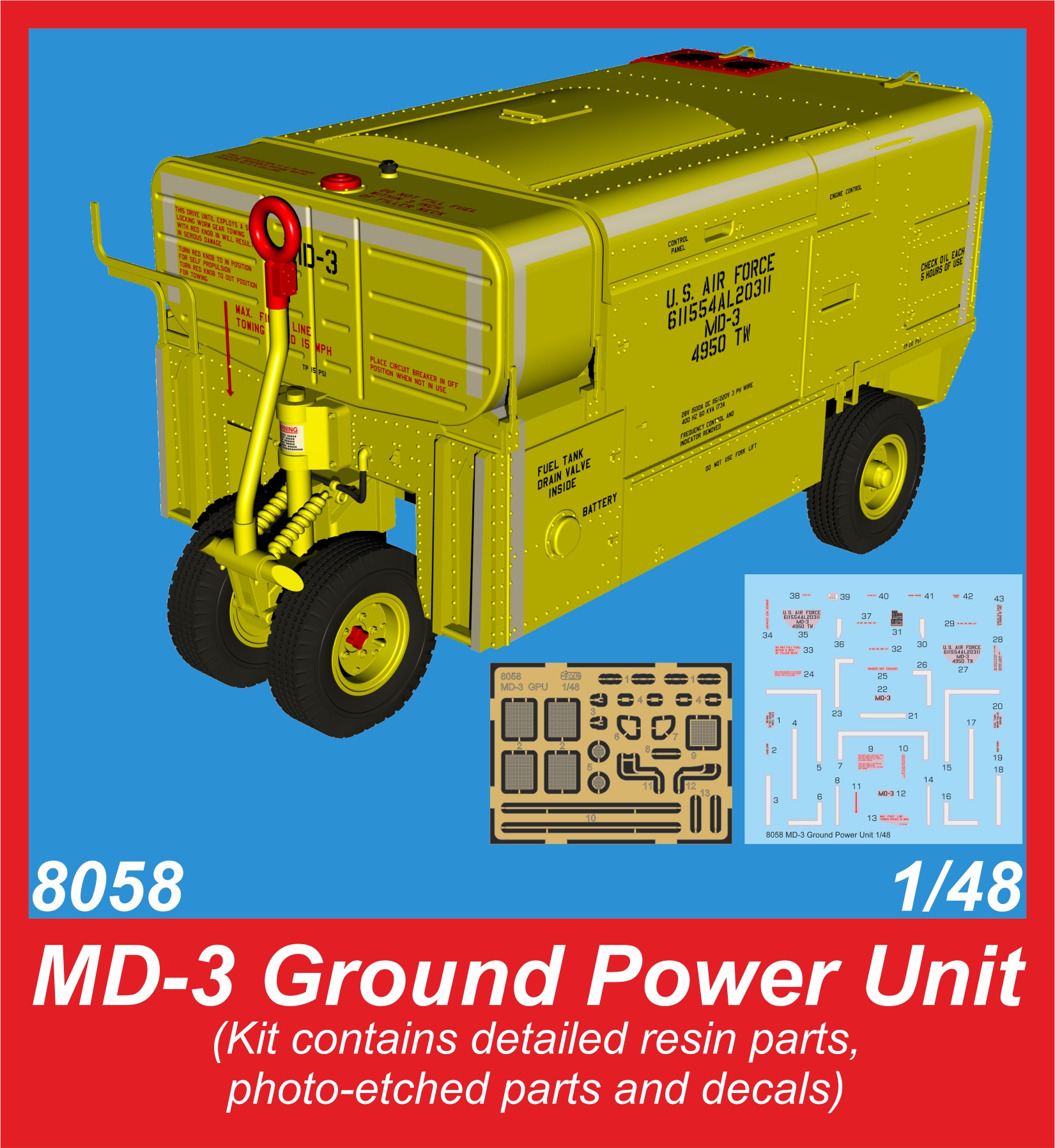 CMK - 1/48 MD-3 Ground Power Unit. The MD-3 ground power unit was used throughout the 50s and 60s to generate electric power for starting up engines of such USAF aircraft as were the B-47, T-33 and many other with the same power requirements. The master parts of our kit have been 3D designed and produced on a 3D printer. The set also contains a Pe fret and a sheet of decals.