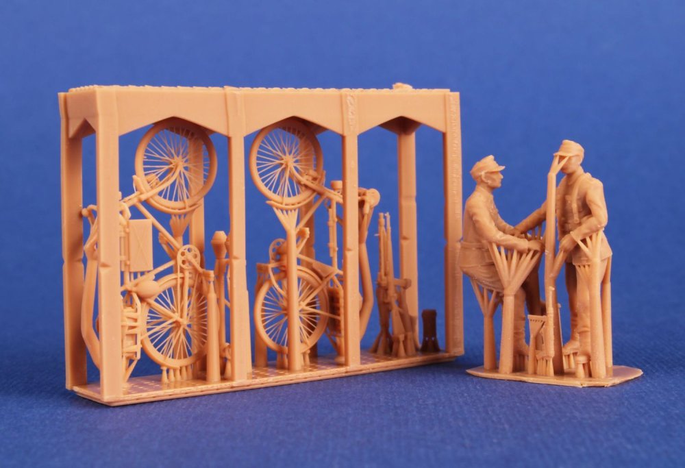CMK - 1/72 Wehrmacht Soldiers with Military Bicycles The same pair of soldiers as in the 1/48 set, now scaled down to 1/72 and 3D printed. A pair of German soldiers with military type bicycles and armament. One soldier rides his bike, the other one pushes it besides him. The armament carried on the bikes is quite varied, from a rifle to a pair of panzerfausts. All parts 3D-printed with superb detail levels.