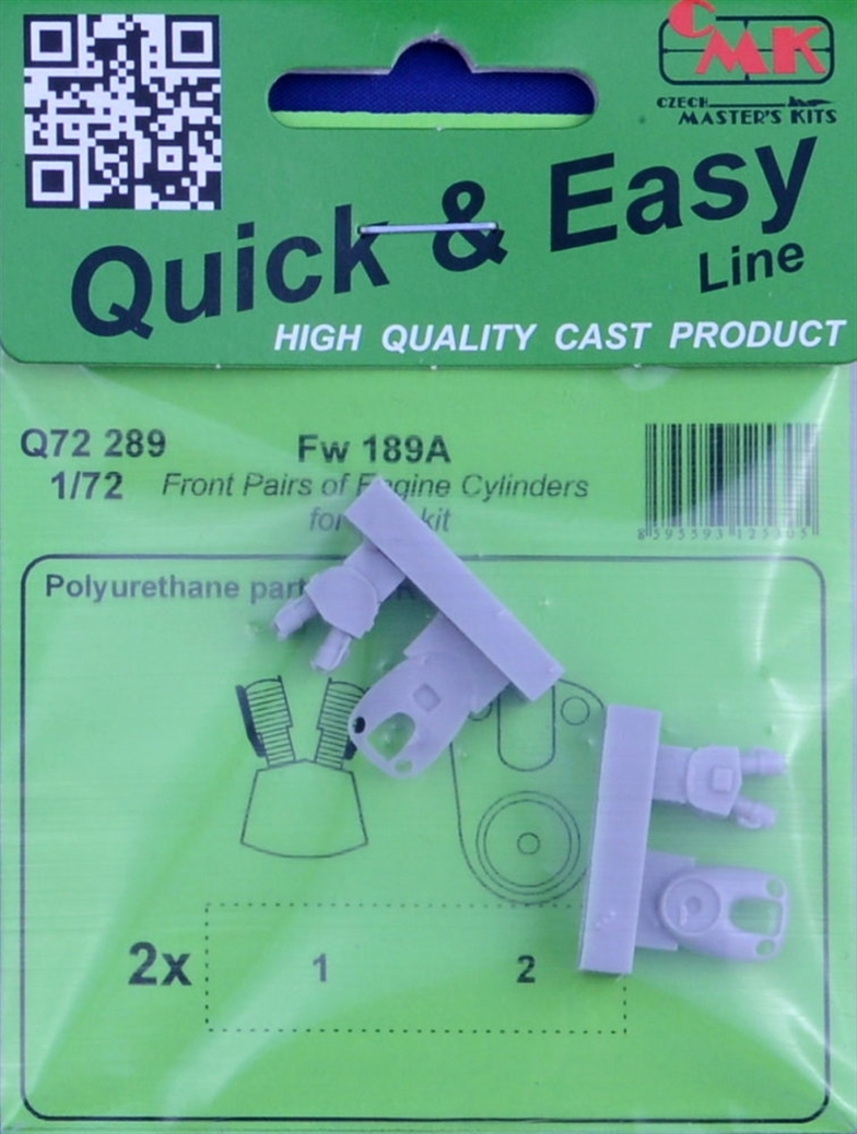 CMK - 1/72 Focke-Wulf Fw-189A-1/Fw-189A-3 - Front Pairs of Engine Cylinders (for ICM kits) Even such a nice kit as the new ICM Fw 189A no doubt is has its small flaws. One of them obviously is the incorrectly shaped engine nacelle air intakes. Our set offers you new front sections of the nacelles into which just fit another resin parts portraying the front pairs of Argus As 410 engine cylinders. This set enables the modeller to look through the air intakes and clearly see the engines inside.