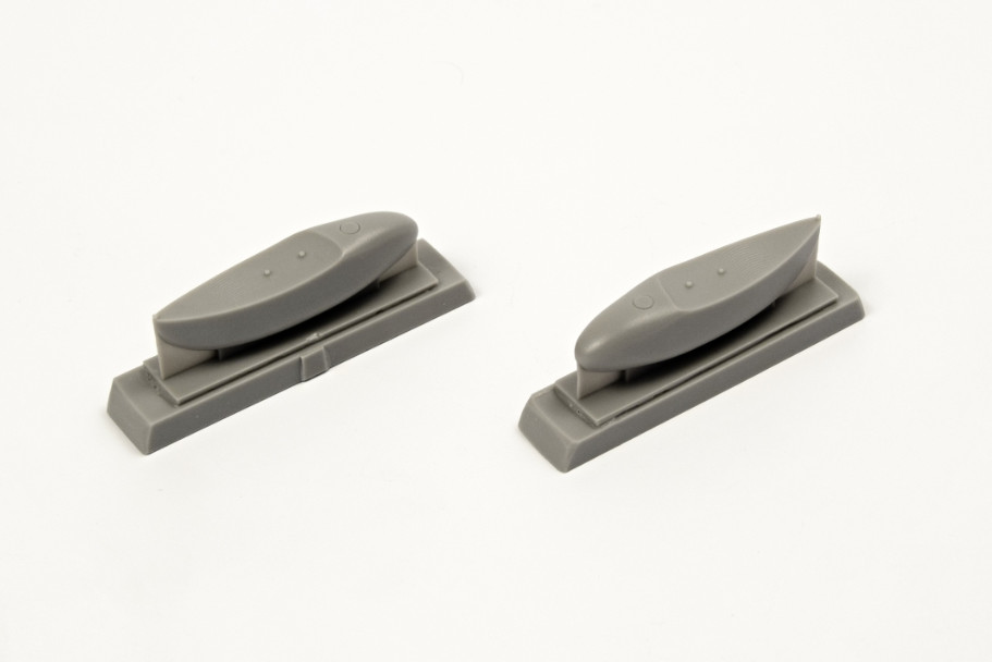 CMK - 1/72 de Havilland Vampire Mk.I Underwing Slipper Tanks (2 pcs) (for Special Hobby kits) The early Vampire jet fighter aircraft could be fitted either with standard underwing fuel tanks on a pylon or with a slipper type similar to those known from the Mosquito. The Special Hobby kit brings just the usual fuel tanks, now this CMK set brings the modeller detail resin cast parts of the fuel tanks mounted directly on the wing surface.