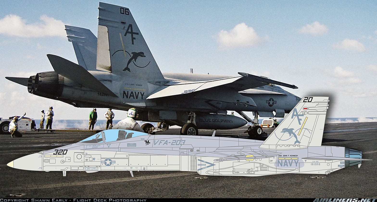 F/A-18A+ Hornet, 161959/AF320, VFA-203 'Blue Dolphins', Uss John F Kennedy, July 2000.