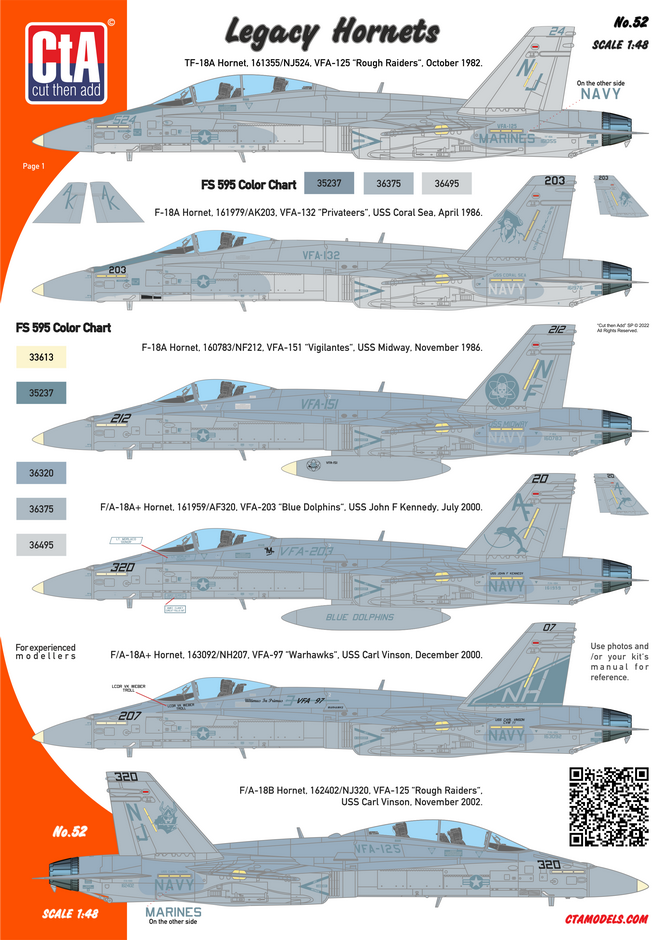 CtA Cut then Add - 1/48 'Legacy Hornets' McDonnell-Douglas TF-18A, F-18A, F-18A+, F/A-18B. 6 Markings USN/USMC