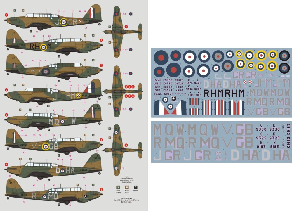 DK Decals - 1/72 Fairey Battle Mk.I1. Battle Mk.I, L5549, No.301 Sq. RAF2. Battle Mk.I, L5216, No.88 Sq. RAF3. Battle Mk.I, L5513, No.103 Sq. RAF4. Battle Mk.I, K9327, No.103 Sq. RAF5. Battle Mk.I, K9330, No.226 Sq. RAF6. Battle Mk.I, K9342, No.105 Sq. RAF7. Battle Mk.I, K9325, No.218 Sq. RAF8. Battle Mk.I, K9183, No.226 Sq. Raf