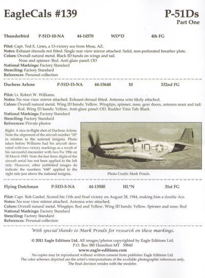 Eagle Cal - 1/72 North-American P-51D Mustang Part 1 (3) 44-14570 WD-D 334th Fs 4th Fg Capt Ted E. Lines 'Thunderbird' red nose, 44-15648/10 Lt Robert W.Williams 'Duchess Arlene' red tail, 44-13500 HL-N 31st Fg Capt Bob Goebel 'Flying Dutchman' red striped tail