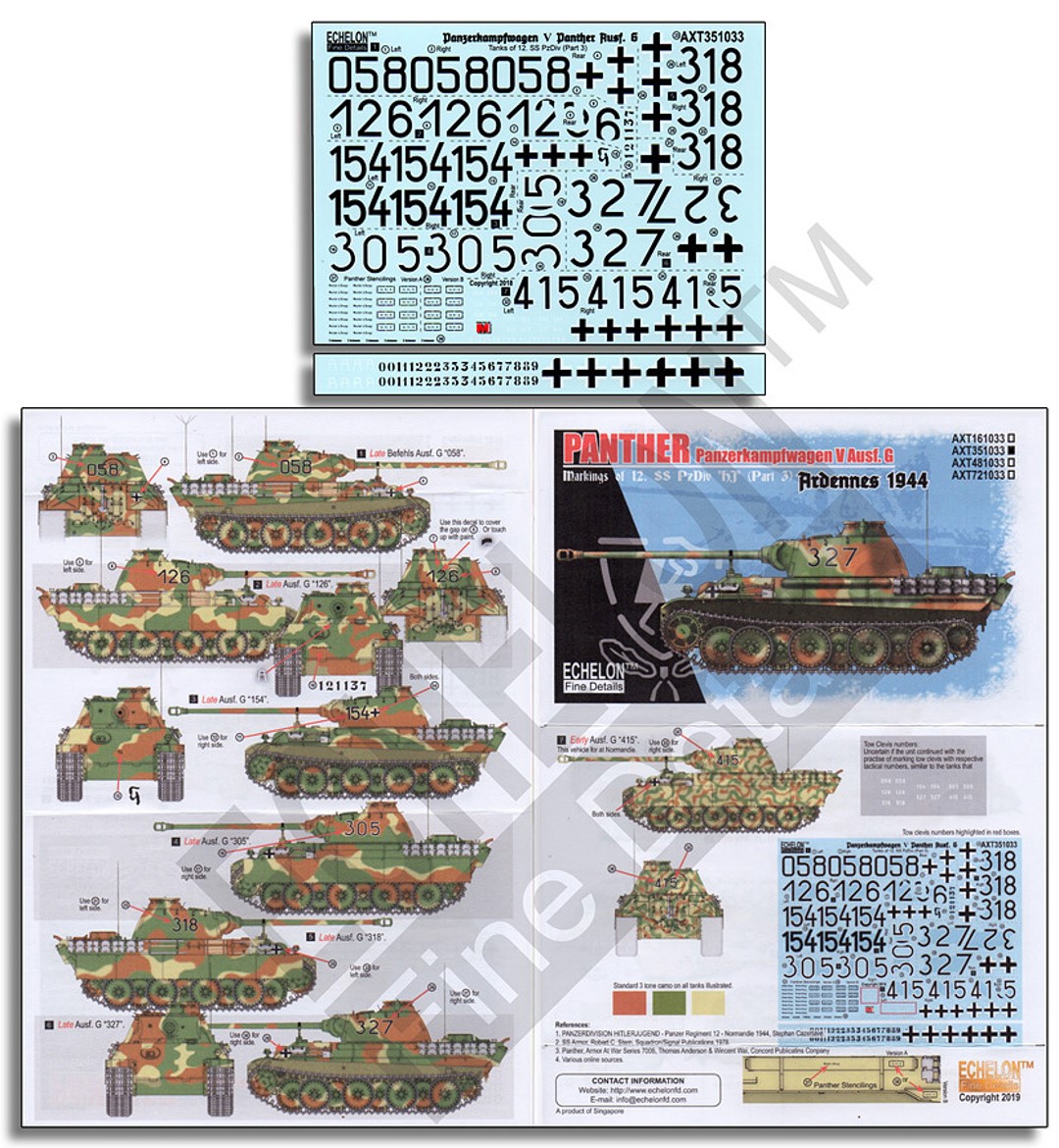 Covers 6 specific Panther Ausf. Gs (early & lates) from 12. SS Panzer Division that saw action at Ardennes,1944 (plus 1 at Normandy). The colours of the numbers are white outlines on black, just like their Panzer IV counterparts in Normandy. Also included are small matching tactical numbers that were painted on tow clevises, G and A symbols, and hull registration numbers.