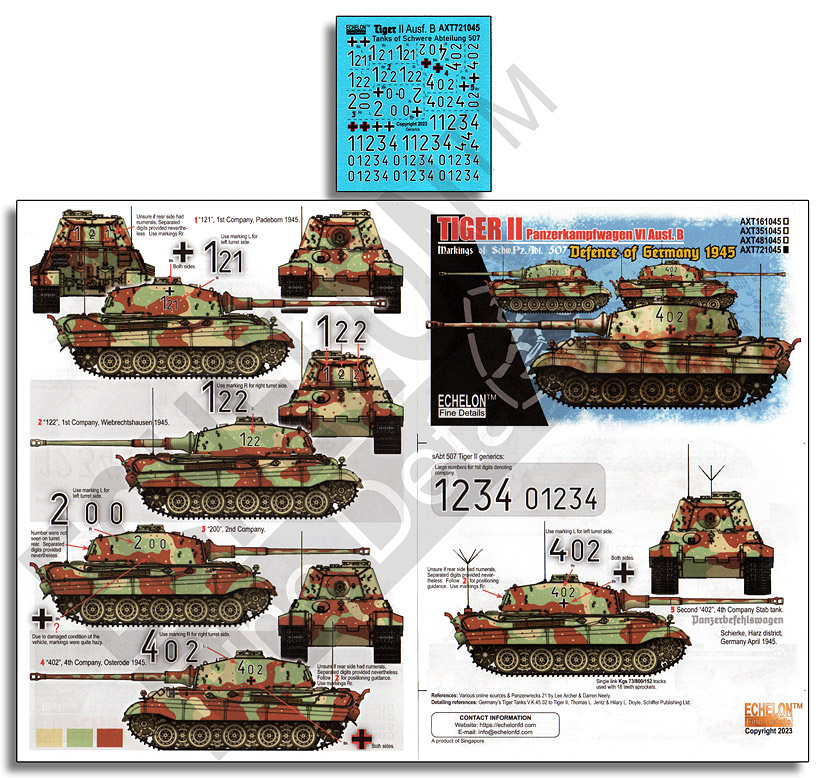 sAbt 507 Tiger IIs that saw action in the Paderborn area, 1945. Pecular to the unit, like their Tiger Is, the first digit of the turret numbers were larger and stood taller than the second and third digits platoon and tank. Except that the colours were reversed white outlines on solid black. Of interest is one of the '402's featured on this set, which was with single-link tracks driven by18-tooth sprockets, and was fitted out as a Panzerbefehlswagen antenna base on the turret, rear of the loader's hatch, antenna pot on the center rear of the engine deck and antenna tube across the rear edge of the hull. In other words, a stab Tiger II with late-war tracks. Also included are Turret number generics.