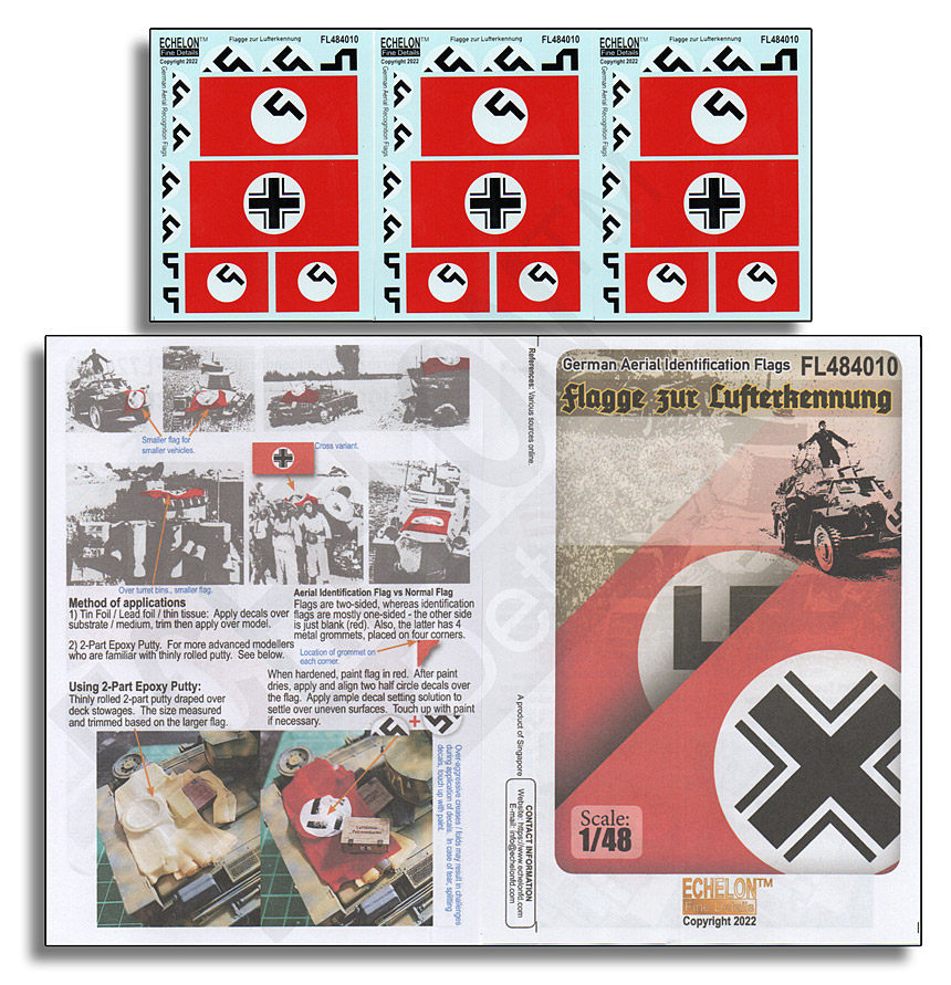 Echelon FD - 1/48 German Aerial Identification / Recognition Flags (WWII) Aerial markers (as ground identifiers at times) used on all fronts in 3 common sizes. Smaller ones are often used on turret bins or across the rear deck of smaller panzers and on the front of softskin AFVs, while the large ones were used on engine decks medium panzers. Also included is the balkenkreuz variety. To be used wholesale or partial on soft medium like tissue, thin paper, thin foil or any suitable substrate. For those familar with the rolled 2-part epoxy putty technique, the partial 2-part markers will be useful. All flags are based on documented measurements.
