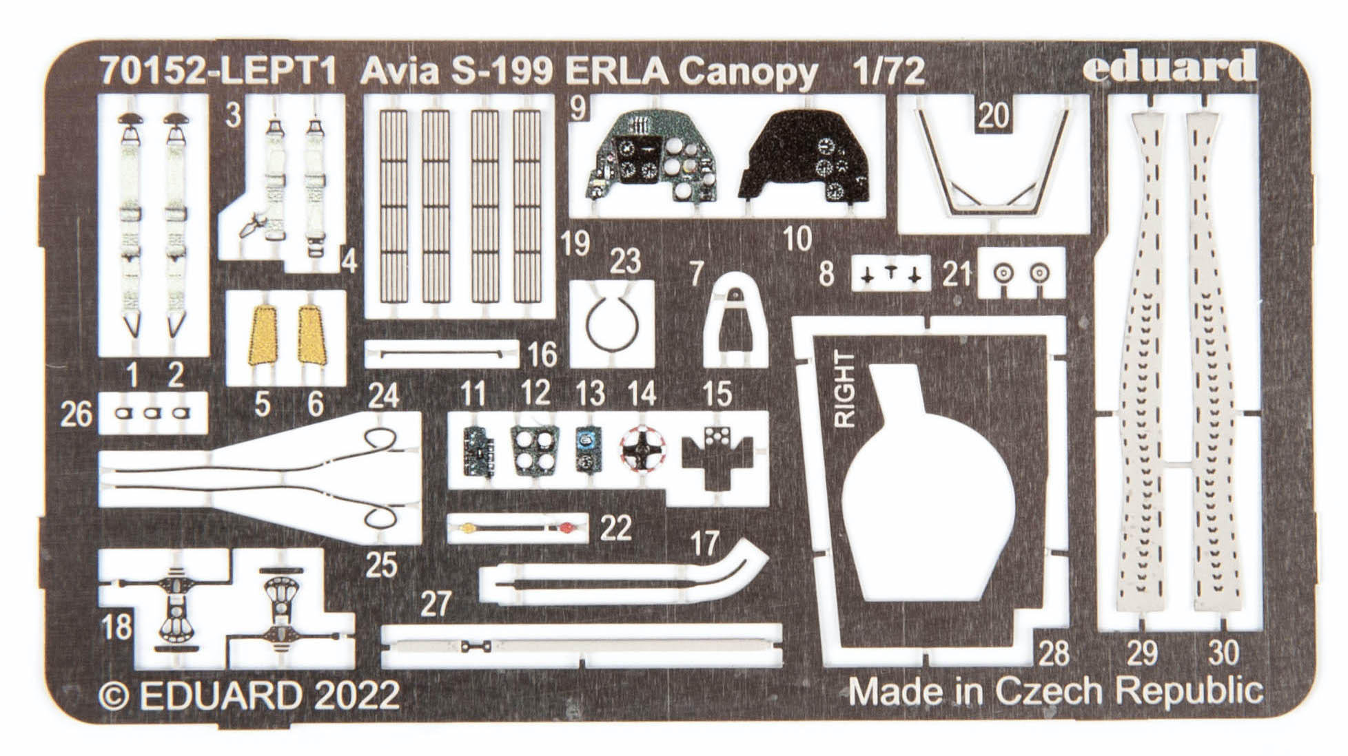 Eduard - 1/72 Avia S-199 Erla canopy ProfiPACK edition kit of Czechoslovak single engine fighter Avia S-199 with Erla canopy in 1/72 scale. plastic parts: Eduard marking options: 6 decals: Eduard Pe parts: yes, pre-painted painting mask: yes resin parts: no