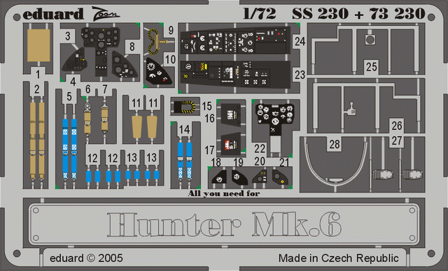 Eduard - 1/72 Hawker Hunter F.6 PRE-PAINTED In COLOUR! (for Revell kits) Includes about 20 of the more important and prominent parts for detailing the aircraft. Most sets are also available as part of a double set for the modeller who wants even more detail. Please see the picture for the double set part number.
