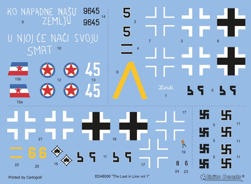 Entitled The Last in Line vol.1, this decal set is the first of a series devoted to the German aircraft produced in the last months of World War II. This release covers three Bf 109 G-10s manufactured by WNF, including one machine used in the postwar Yugoslavia: